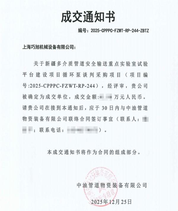 12月25日,上海巧旭正式收到中油管道物资装备有限公司发出的中标通知,成功中标磁力循环泵采购项目。该项目将服务于“新疆多介质管道安全输送重点实验室试验平台建设”,项目编号为2025-CPPPC-FZWT-RP-244。作为科研试验平台的重要组成设备,磁力循环泵不仅承担介质循环输送功能,更直接关系到实验系统的安全性与数据稳定性。与常规工程项目相比,科研平台在设备选型阶段更关注运行过程的可控性与适应性,这也使得该项目在前期技术交流阶段即呈现出较强的专业属性。